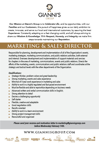 Gianni's Group is looking for a Marketing & Sales DirectorGianni's GroupFeb 7, 20181 min readWe're hiring! Gianni's Group is looking for a Marketing & Sales Director. Please send your resume and motivation letter to marketing@giannisgroup.com